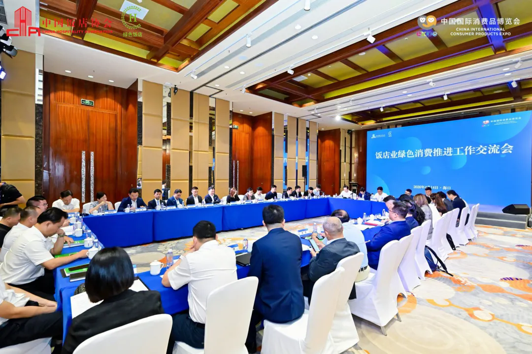 4月14日,在商务部和海南省人民政府共同主办的第六届中国国际消费品博览会期间,饭店业绿色消费推进工作交流会在海南省海口市举行。会议旨在贯彻习近平总书记就服务业发展作出的重要指示精神,落实商务部等九部门《关于实施绿色消费推进行动的通知》、《服务消费提质惠民行动2026年工作方案》,交流推广绿色消费促进、打造“中国服务”品牌的实践经验。来自地方商务主管部门、全国知名住宿及餐饮企业集团、线上平台及绿色饭店代表企业等单位的负责人参会。