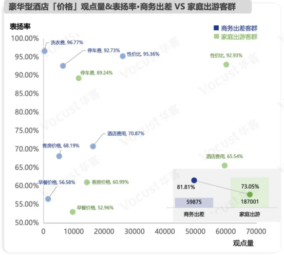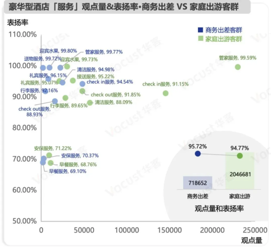 在服务洞察中,新增了对豪华型酒店的点评观点洞察,从服务和价格两个维度,洞悉商务出差 VS 家庭出游客群的观点量和表扬率。