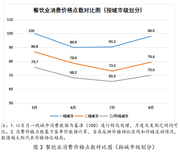 以城市级视角来看(图3),5-7月餐饮业消费价格点数整体呈现下降趋势,至8月迎来回升,一线、二线和三线城市餐饮消费价格点数分别环比增长8.5%、8.8%和6.9%。从具体表现上,一线城市恢复水平较为理想,8月消费价格点数基本恢复到基期水平;二线城市餐饮消费价格点数回升速度最快,且超过一线城市,反映出下沉市场的强大动力。