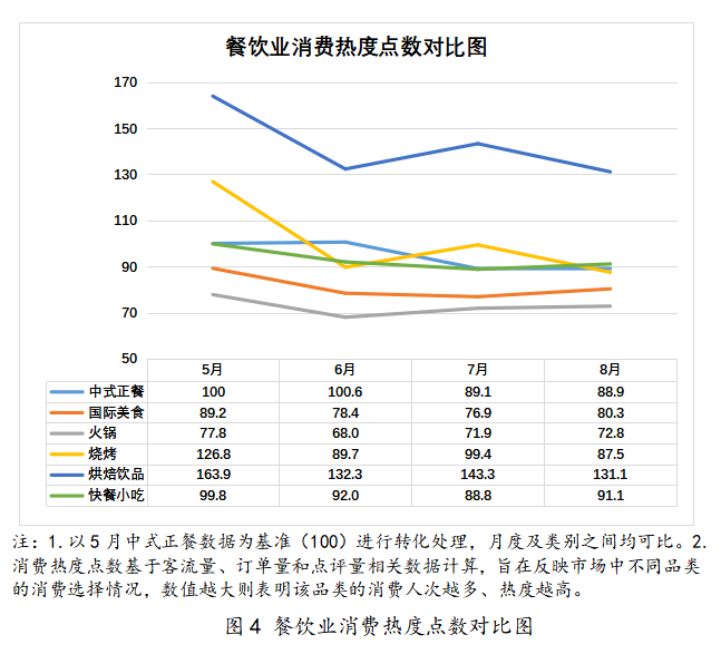 客流量指数在6月出现下降明显,7-8月迎来回升,与暑期市场发展趋势保持一致。为进一步反映不同餐饮品类的线下消费场景消费热度变动情况,绘制餐饮业消费热度点数对比图(见图4)。