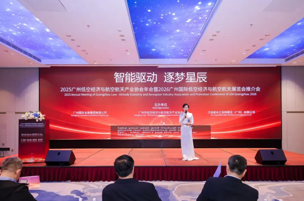 1月15日,由广州市低空经济与航空航天产业协会、广州国际会展集团有限公司、汉诺威米兰佰特展览(广州)有限公司联合主办的“智能驱动 逐梦星辰——广州市低空经济与航空航天产业协会2025年会暨2026广州国际低空经济与航空航天展览会推介会”在广州宾馆盛大举行。