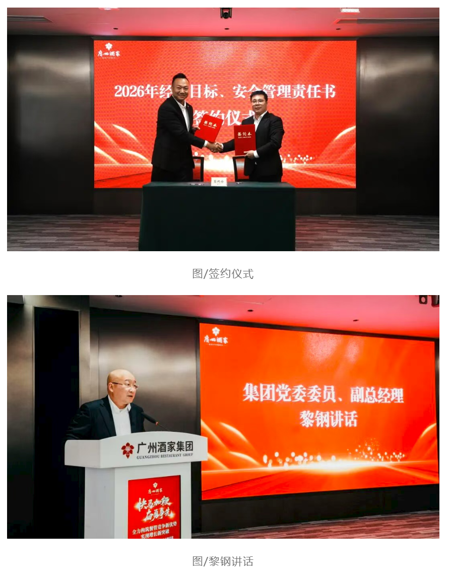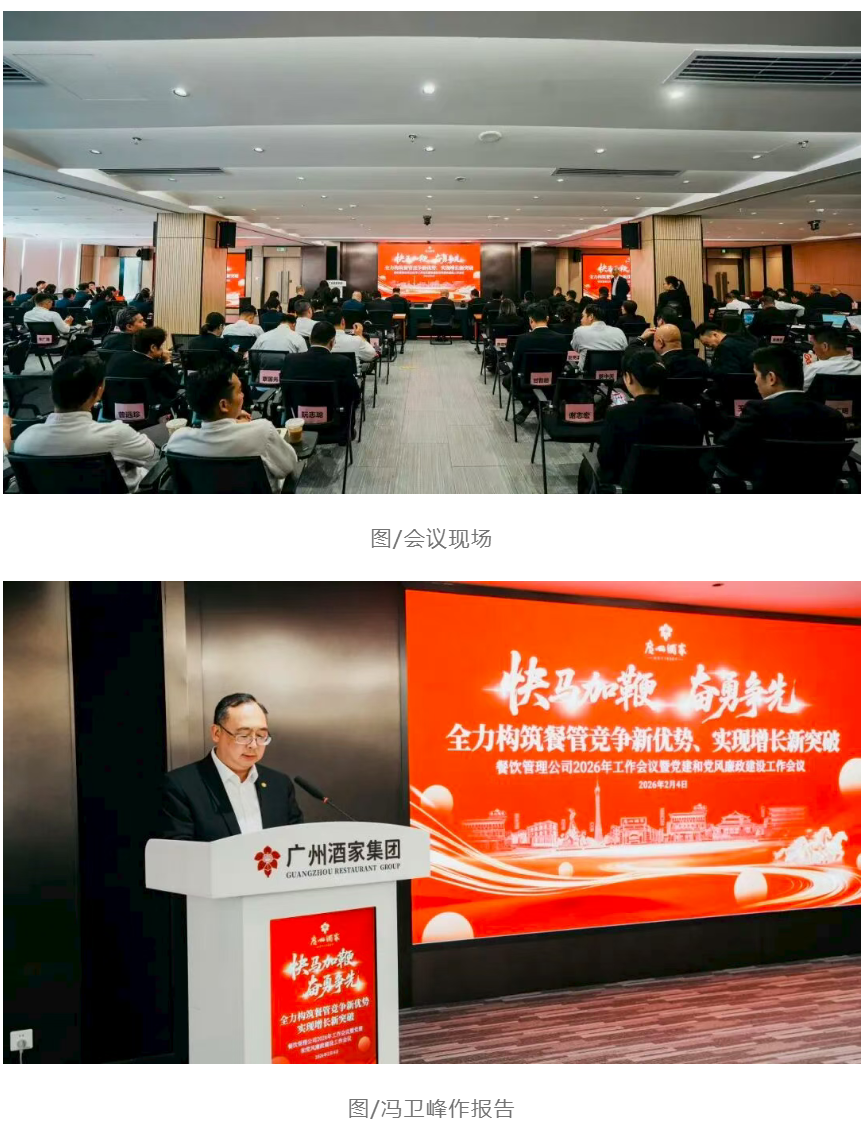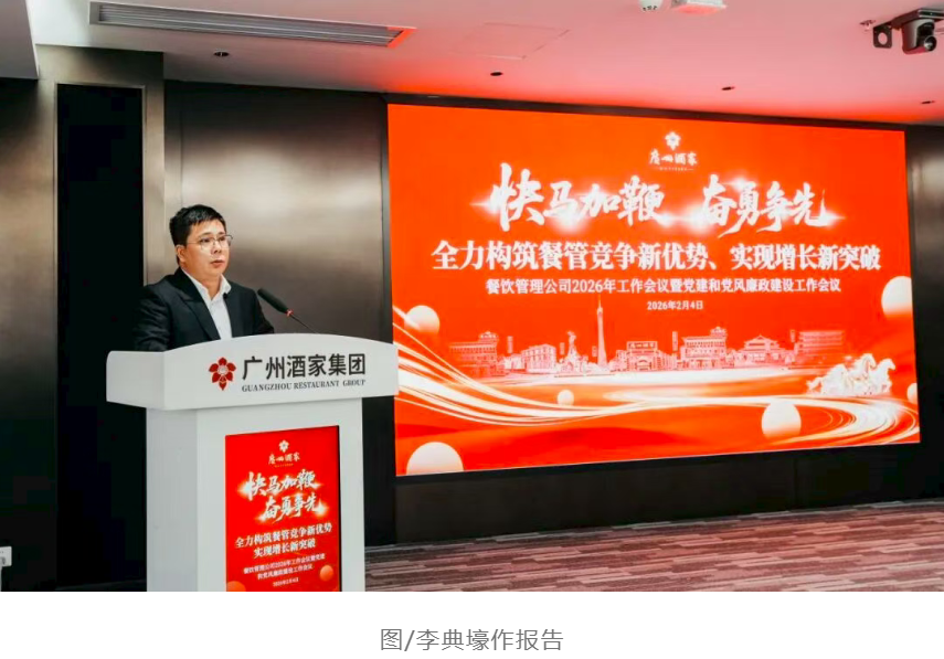 2月4日,广州酒家集团餐饮管理公司召开2026年工作会议暨党建和党风廉政建设工作会议,全面总结2025年经营成果,研判行业发展态势,部署2026年重点任务,并表彰先进典型,凝聚全员奋进力量。集团党委委员、副总经理黎钢,餐饮管理公司党政领导班子、中层管理人员及职工代表出席会议。