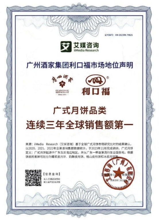 图:广州酒家集团广式月饼品类连续三年全球销售额第一认证证书
