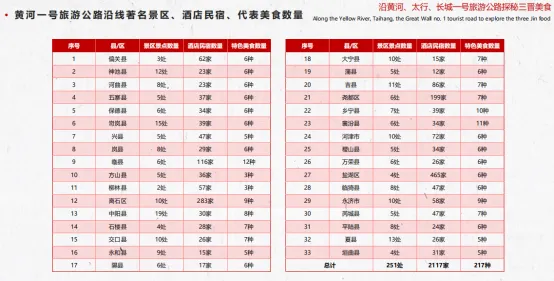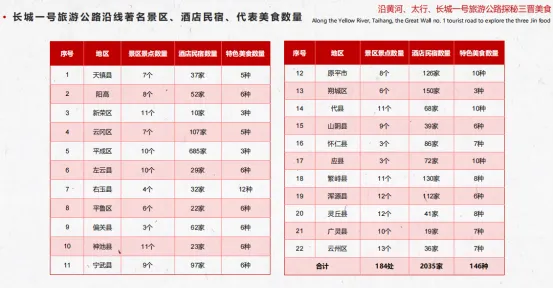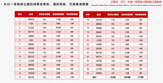 “沿黄河、太行、长城一号旅游公路探秘三晋美食”报告指出,黄河一号旅游公路全长1238公里,自忻州市偏关县起始,途经忻州、吕梁、临汾、运城四市,终点落于运城市垣曲县。沿线33个县区,景区景点251处、酒店民宿2117家、特产美食217种。太行一号旅游公路蜿蜒绵长1028公里,自忻州繁峙起始,终至运城垣,沿途穿越太原、阳泉、晋中、长治、晋城等6市,沿线29个县区、景区景点262处,酒店民宿3008家、特色美食233种。长城一号旅游公路全长达1201公里,始于大同天镇,穿越大同、朔州、忻州三市,沿线22个县区,景区景点184处,酒店民宿2035家、特色美食146种。根据文化传统、社会影响、喜爱度调查推出“黄河、太行、长城一号旅游公路”代表美食各10种。