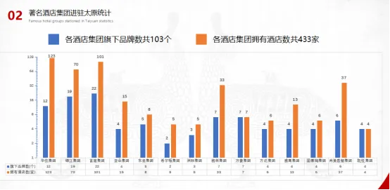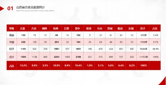 山西省住宿业数据统计报告指出,截止目前,山西省住宿企业共计11353家。从酒店数量看,前四位是忻州、晋中、太原、大同等四个城市,占到全省住宿企业的62.4%。从酒店质量看,高端酒店数量为609家,占到整个住宿企业数量的5.36%;中端级酒店数量为1098家,占到整个住宿企业数量的9.67%;而经济型酒店(民宿)数量为9646,占到整个住宿企业数量的84.97%。从酒店品牌看,著名酒店集团进军山西市场,根据城市发展不同,其数量约占整个住宿企业数量的8%至28.8%。以太原为例,拥用14个酒店集团旗下品牌约103个,连锁酒店433家。