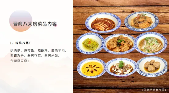 “晋商八大碗”桌菜制作工艺标准报告指出,为了贯彻“晋菜晋味突破提升行动”,持续开展“品鉴山西美食、晋享山西味道品牌推广”活动,商会组织行业专家经过多轮实践,在推出“十大晋菜、十大新派晋菜”之后,再次推出“晋商八大碗”桌菜制作工艺标准,内容是:四干四鲜、经典八凉、传统八蒸、八面玲珑,其中,传统八蒸为:扒肉条、蒸酥鸡、蒸带鱼、醋浇羊肉、四喜丸子、蒸鲜“黄花菜”、蒸黄米饭、台蘑蒸豆腐。晋商八大碗的成功推出,必将对进一步传承和弘扬山西饮食文化产生深远影响。