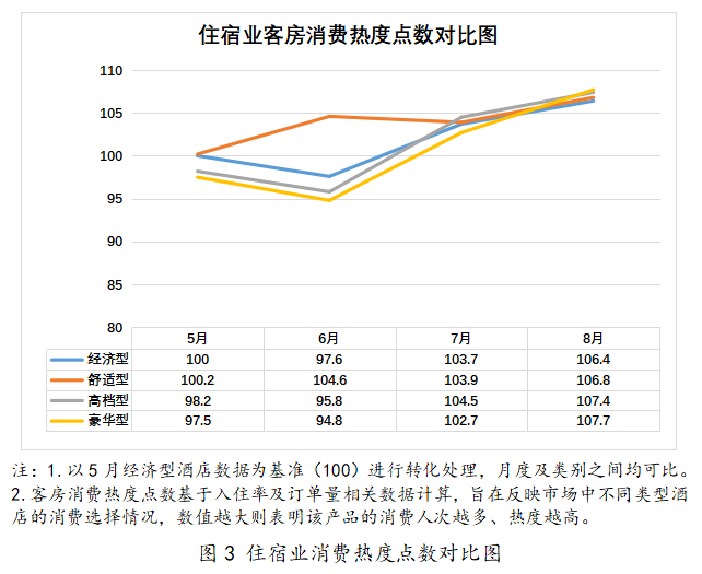 为进一步反映不同类型酒店消费热度变动情况,绘制住宿业客房消费热度点数对比图(见图3)。数据显示,四类酒店的消费热度在暑期均呈现总体上升的态势。8月,经济型、舒适型、高档型和豪华型消费热度点数分别环比增长2.6%、2.8%、2.8%和4.9%,豪华型酒店引领暑期住宿消费热度增长,反映高净值客群需求韧性。经济型酒店消费热度点数从100上涨至106.4,刚需市场触底反弹。
