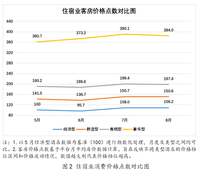 为进一步反映不同类型酒店的客房价格变动情况,绘制住宿业客房价格点数对比图(见图2)。数据显示,7-8月暑期住宿业客房价格水平出现季节性上涨,超过基期水平,并在暑期保持稳定。