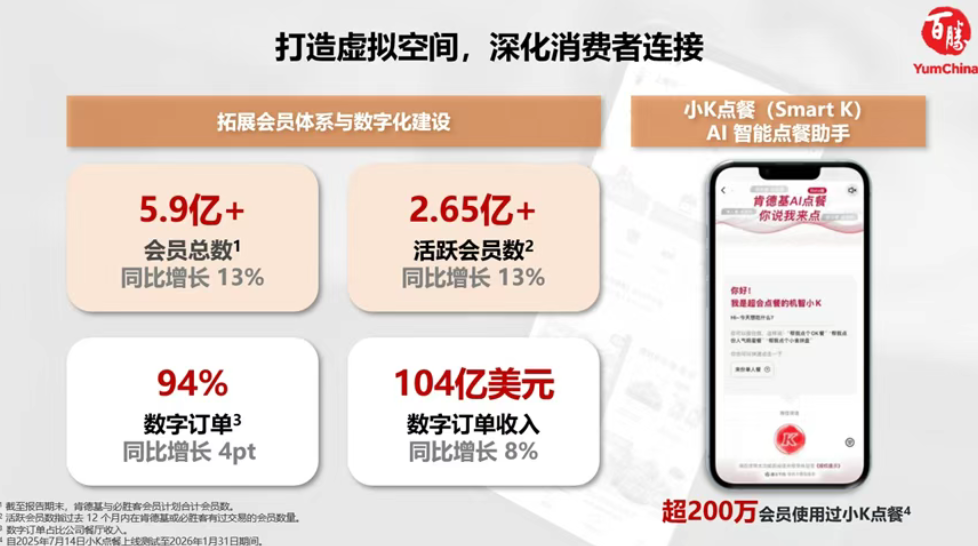 百胜中国不断拓展会员体系与数字化建设,进一步深化了与消费者的连接。截至2025年底,肯德基与必胜客会员数合计突破5.9亿,同比增长13%。 活跃会员数,即过去12个月内在肯德基或必胜客有过交易的会员数量,超过2.65亿,同比增长13%。近期,AI语音点单助手“小K点餐”已经全面上线肯德基超级APP,并被超过200万会员使用,为消费者提供更贴切、更便捷的点餐服务。