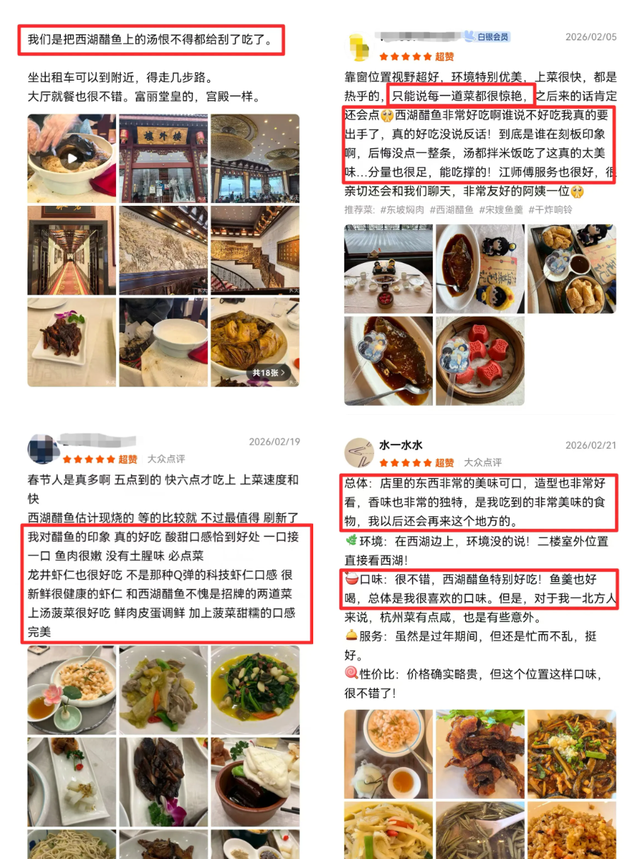 大众点评、小红书等社交平台上,顾客们纷纷晒出用餐体验,点赞楼外楼的地道口味和暖心服务。一条条好评,如春风拂面,见证着这座老字号与新时代的温情互动。