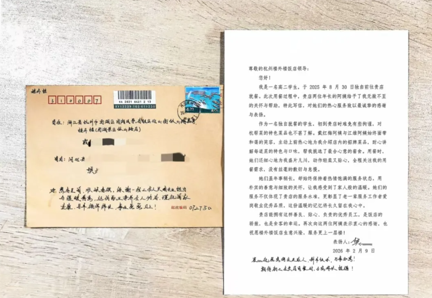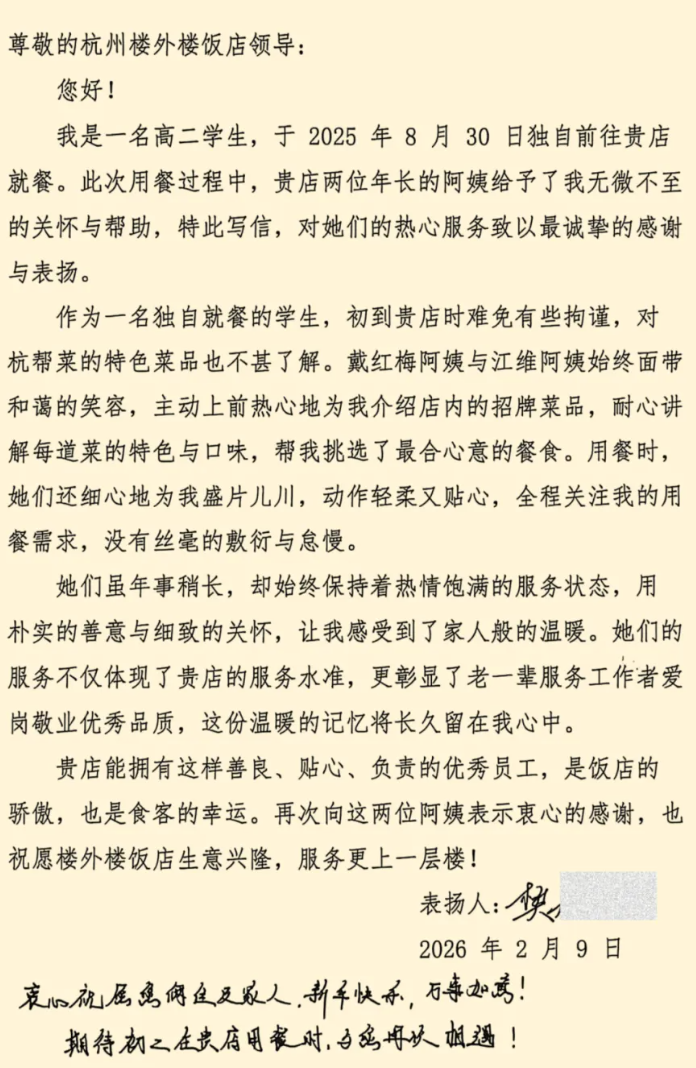 一封来自河北的感谢信悄然送至楼外楼。字里行间,写满对服务员用心用情服务的诚挚感谢。