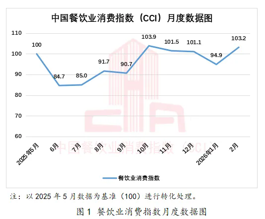 2026年1—2月,中国餐饮业消费指数分别为94.9和103.2。随着企业年会接近尾声、宴会需求基本完成释放,加之临近春节,节前效应明显,1月指数值较2025年12月有所回落。但进入2月在春节假期的带动下,餐饮消费市场迅速升温并呈现良好的发展态势,2月餐饮业消费指数环比1月增长8.7%。