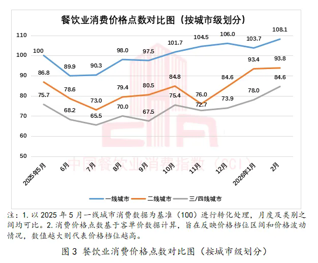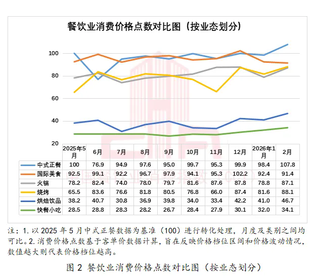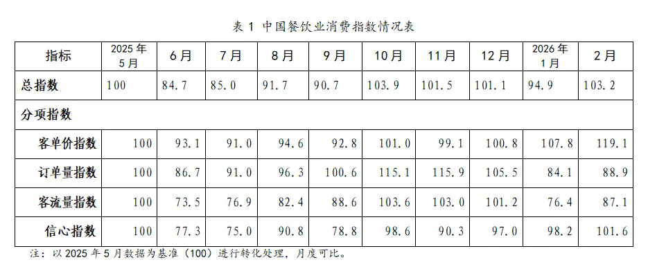 2026年1—2月,信心指数分别为98.2和101.6。2月信心指数环比1月增长3.5%。客单价和客流量的双重增长让从业者看到了实实在在的营收改善,有力提振了经营信心。2月国家和地方层面继续出台各类促消费、促行业发展政策,对于行业信心起到稳定作用。