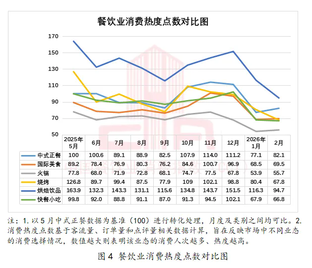 不同餐饮业态的表现分化明显。春节“团圆聚餐”的核心场景使中式正餐成为最大受益者,其消费热度和价格均实现提升;烘焙饮品、快餐小吃和烧烤需求热度有不同程度回落;火锅和国际美食热度温和回暖。这种分化表明餐饮消费具有较强的场景选择性。