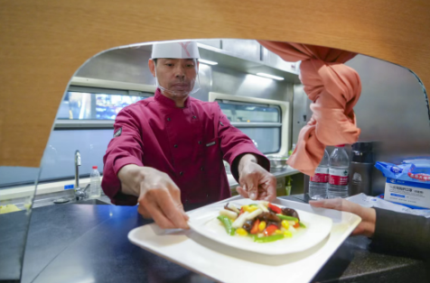 菜单结合时令特点,推出香椿摊鸡蛋、春笋时蔬、芦笋炒百合、炒合菜等清新菜品,将春日的“鲜”与“嫩”搬上移动的餐桌,让游客在飞驰的风景中尽享地道春味。同时,所有餐服人员均接受了系统专业培训,旨在为游客提供更高标准的服务体验。