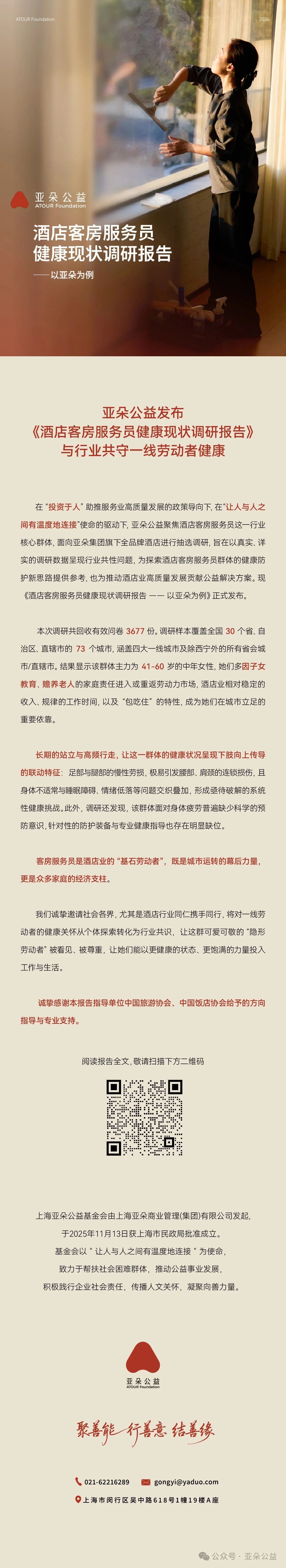 会员动态 | 亚朵公益发布《酒店客房服务员健康现状调研报告》,与行业共守一线劳动者健康
