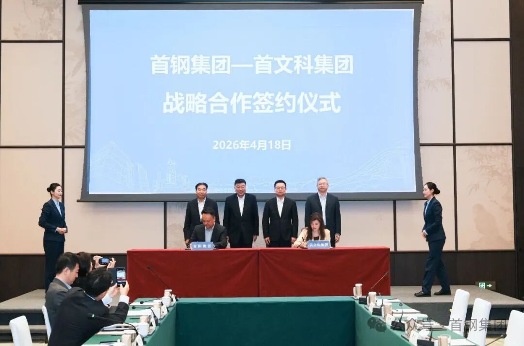 4月18日,首钢集团与首文科集团战略合作签约仪式举行。首文科集团党委书记、董事长潘金峰,党委副书记、董事、总经理徐哲,首钢集团党委书记、董事长赵民革,党委副书记、董事、总经理邱银富见证签约。首钢集团党委常委、副总经理姜楠,首文科集团副总经理董宁代表双方签署协议。邱银富主持签约仪式。