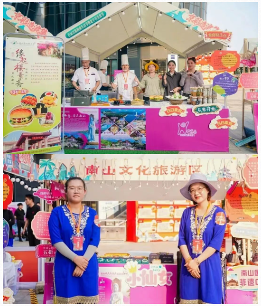南山景区作为本土企业,将禅意文化与非遗技艺带到现场。南山缘起楼带来如意素汉堡、吉祥上上签等特色素斋食品,清新健康、寓意美好;南山非遗中心精心展出琉璃手串、黎锦等非遗文创产品,传统工艺与地域文化交融,为展会增添浓厚文化氛围,吸引众多观众驻足体验。