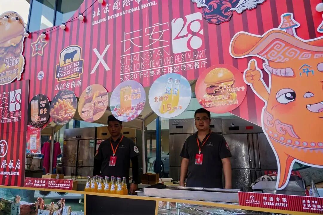 国际饭店以中西融合打造舌尖亮点。招牌二八酱芝士双层牛肉汉堡,选用28天以上干式熟成牛肉,搭配老北京经典二八酱,让西式工艺与地道京味完美结合;干式熟成火焰牛排现场烹炙,香气浓郁、风味出众,成为展台人气爆款。