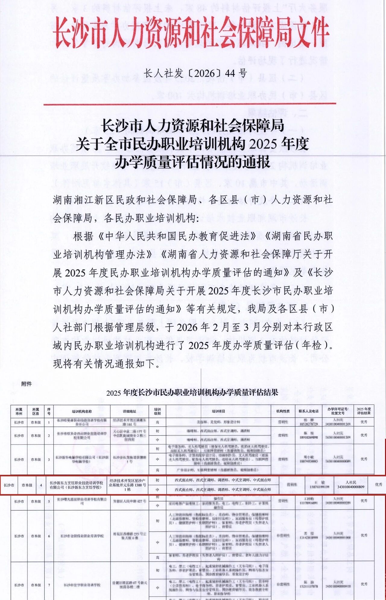 近日,长沙市人力资源和社会保障局正式发布《关于全市民办职业培训机构2025年度办学质量评估情况的通报》。在此次权威评估中,长沙新东方烹饪学校凭借规范的办学管理、优质的教学质量、完善的安全保障措施以及突出的育人成果,从全市众多民办职业培训机构中脱颖而出,获评“2025年度办学质量评估优秀等次”,再次彰显了学校在职业技能培训领域的综合实力与行业标杆地位。